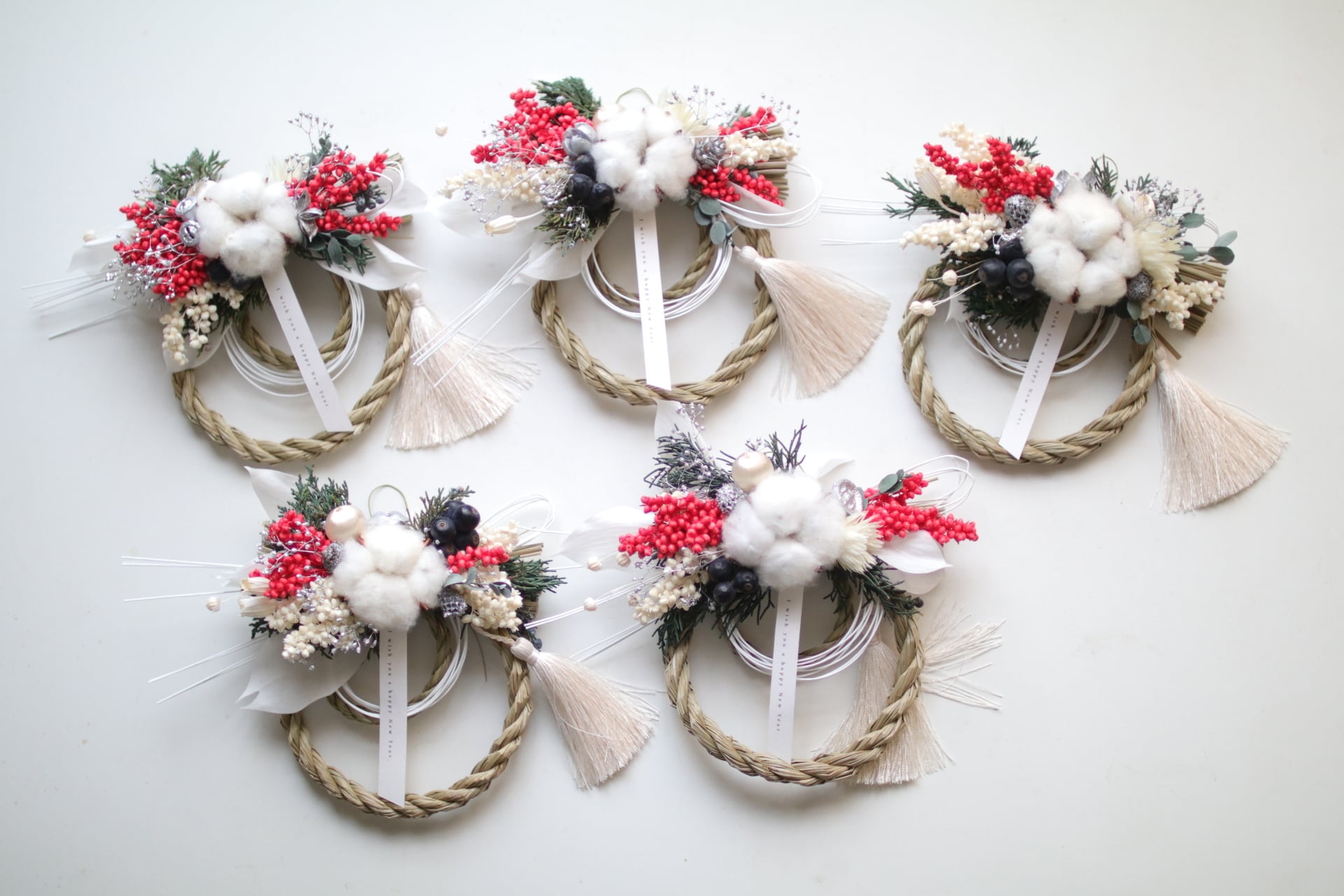 やさしい色合いで仕立てたナチュラルなしめ縄リースです。