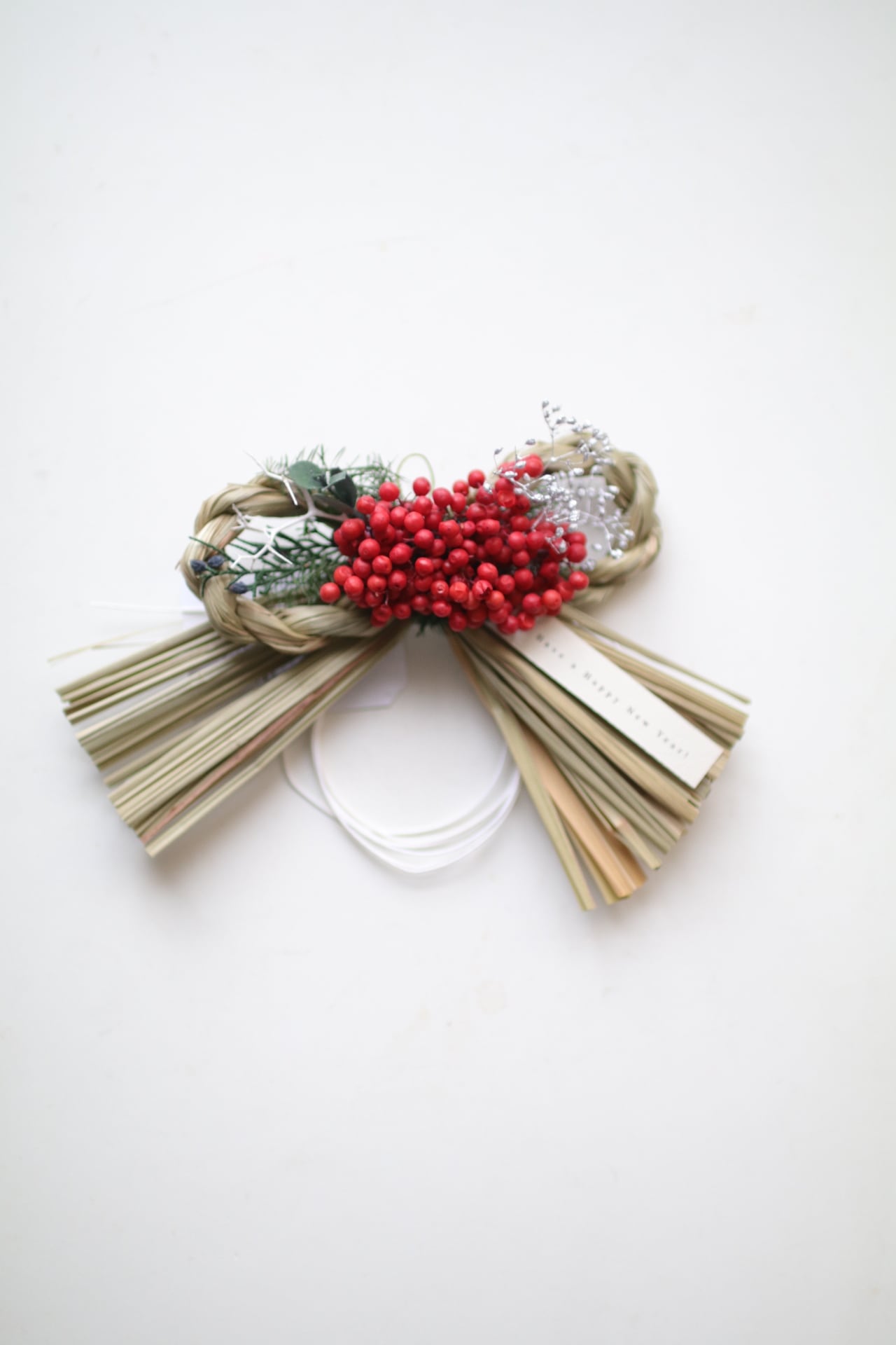 やさしい色合いで仕立てたナチュラルなしめ縄リースです。